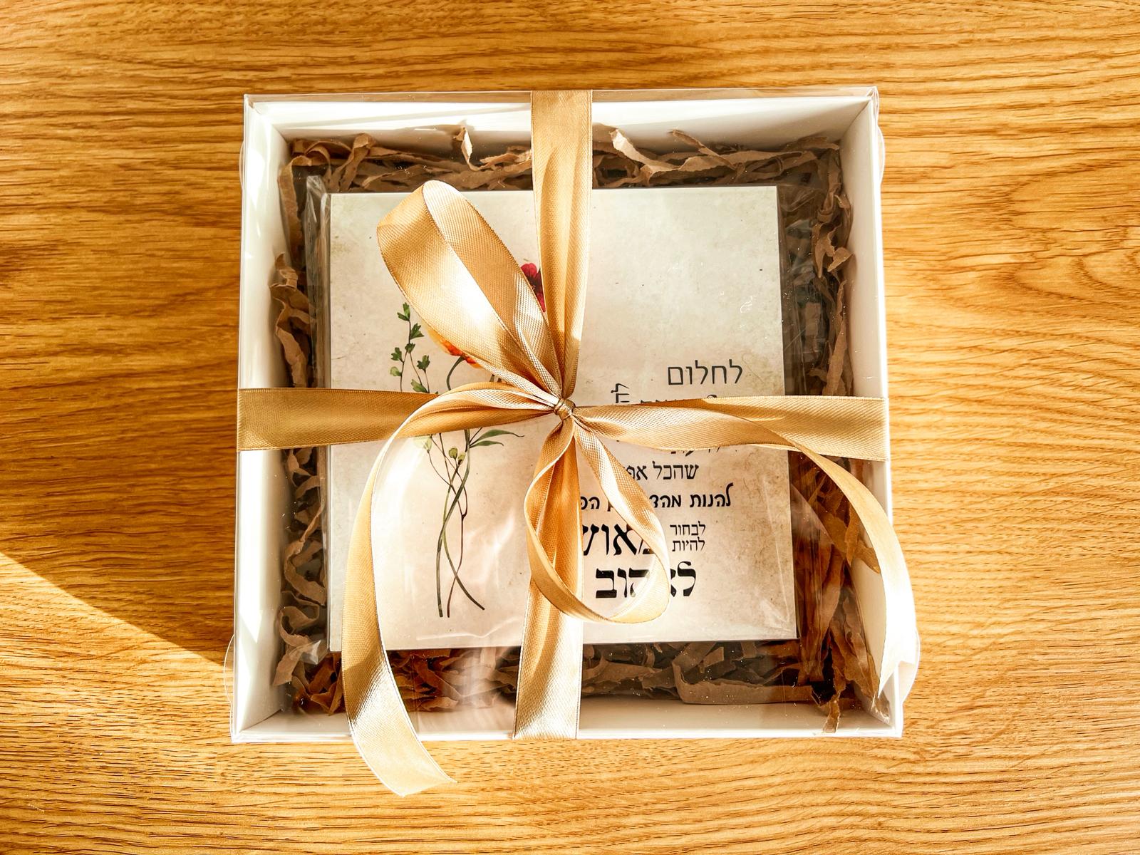 מארז יוקרתי: קופסת מתנה מעוצבת בגודל 20/20/5 ס”מ שנותנת תחושה של השקעה מהרגע הראשון.